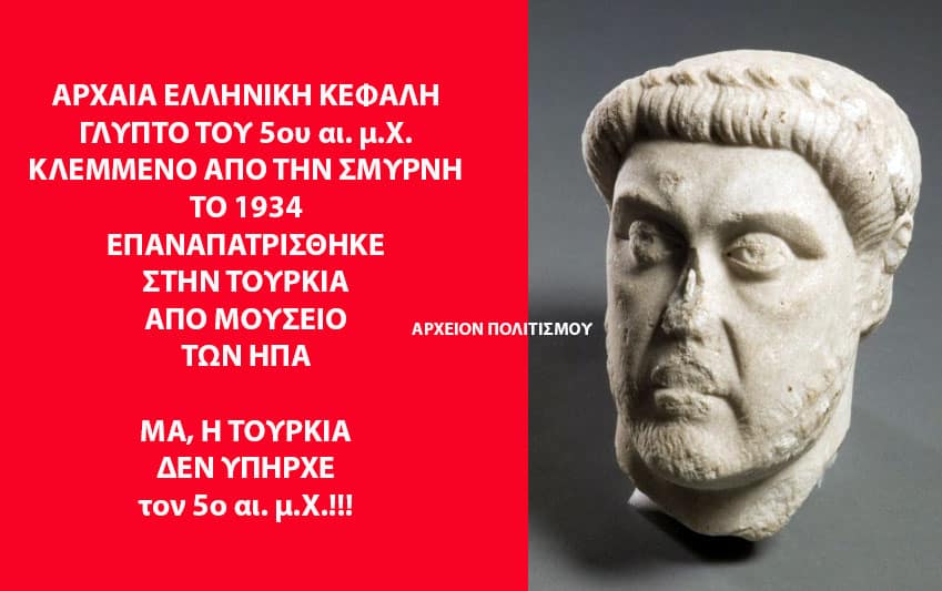 ΠΗΓΗ: «Türkiye repatriates ancient Smyrna marble head from US museum», Yenişafak, ΑΡΧΕΙΟΝ ΠΟΛΙΤΙΣΜΟΥ, 15.4.2026.