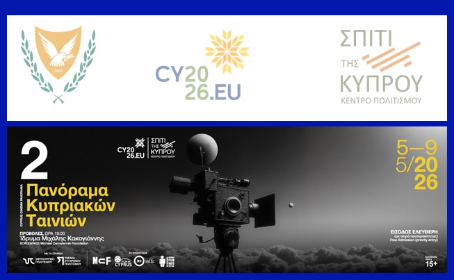 Το Σπίτι της Κύπρου διοργανώνει το 2ο ΠΑΝΟΡΑΜΑ ΚΥΠΡΙΑΚΩΝ ΤΑΙΝΙΩΝ, από την Τρίτη 5 Μαΐου 2026 έως το Σάββατο 9 Μαΐου 2026, στο Ίδρυμα Μιχάλης Κακογιάννης (Πειραιώς 206, Ταύρος 177 78 | τ. 210 3418550) και στο Σπίτι της Κύπρου (Ξενοφώντος 2Α, Σύνταγμα 105 57). Είσοδος ελεύθερη | Με σειρά προτεραιότητας. Για άτομα άνω των 15 ετών.