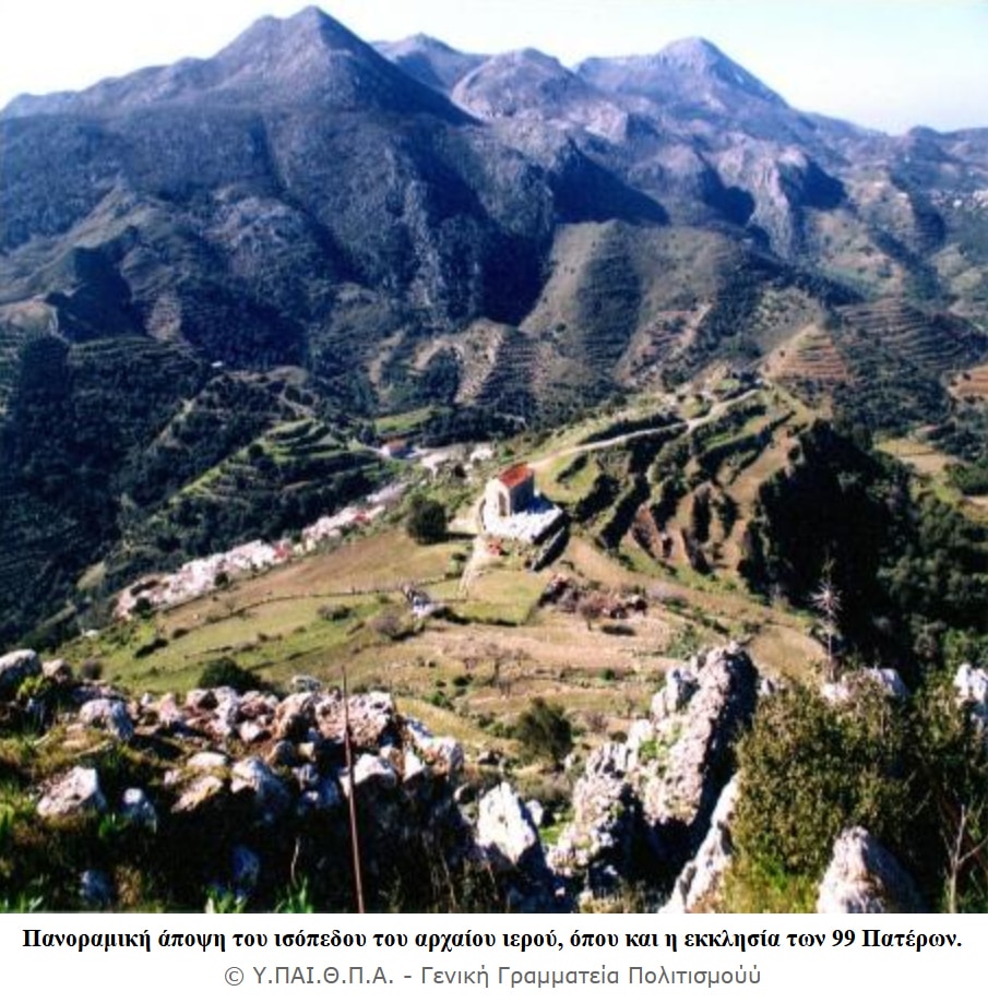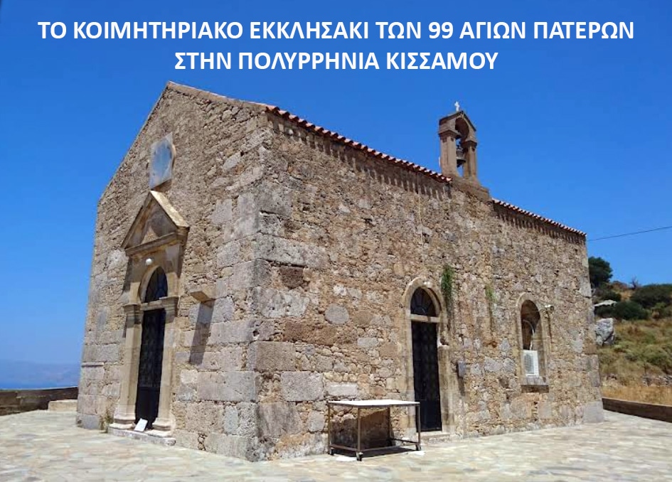 Ανεβαίνοντας στην ακρόπολη συναντάμε την εκκλησία των 99 Αγίων Πατέρων [35.45659070809955, 23.652881027896832] – τέλη 19ου αι. μ.Χ. Ιδιαιτερότητα του ναού αποτελεί η δόμησή του από αρχαίους λίθους και επιγραφές που χρονολογούνται από τον 3ο αι μέχρι και τον 1ο π.Χ. – ΔΙΑΒΑΣΤΕ για τις επιγραφες της Πολυρρήνιας, ΕΔΩ. Στην θέση αυτή η πρώτη απόπειρα ανασκαφής του ιερού από τον αρχαιολόγο F. Halbert και στην συνέχεια από τον Β. Θεοφανείδη, έφερε στο φως αρχαιολογικά κατάλοιπα μνημειώδους βωμού ή ελληνιστικού ναού του 4ου αι. π.Χ., πιθανόν αφιερωμένου στην θεά Άρτεμη.