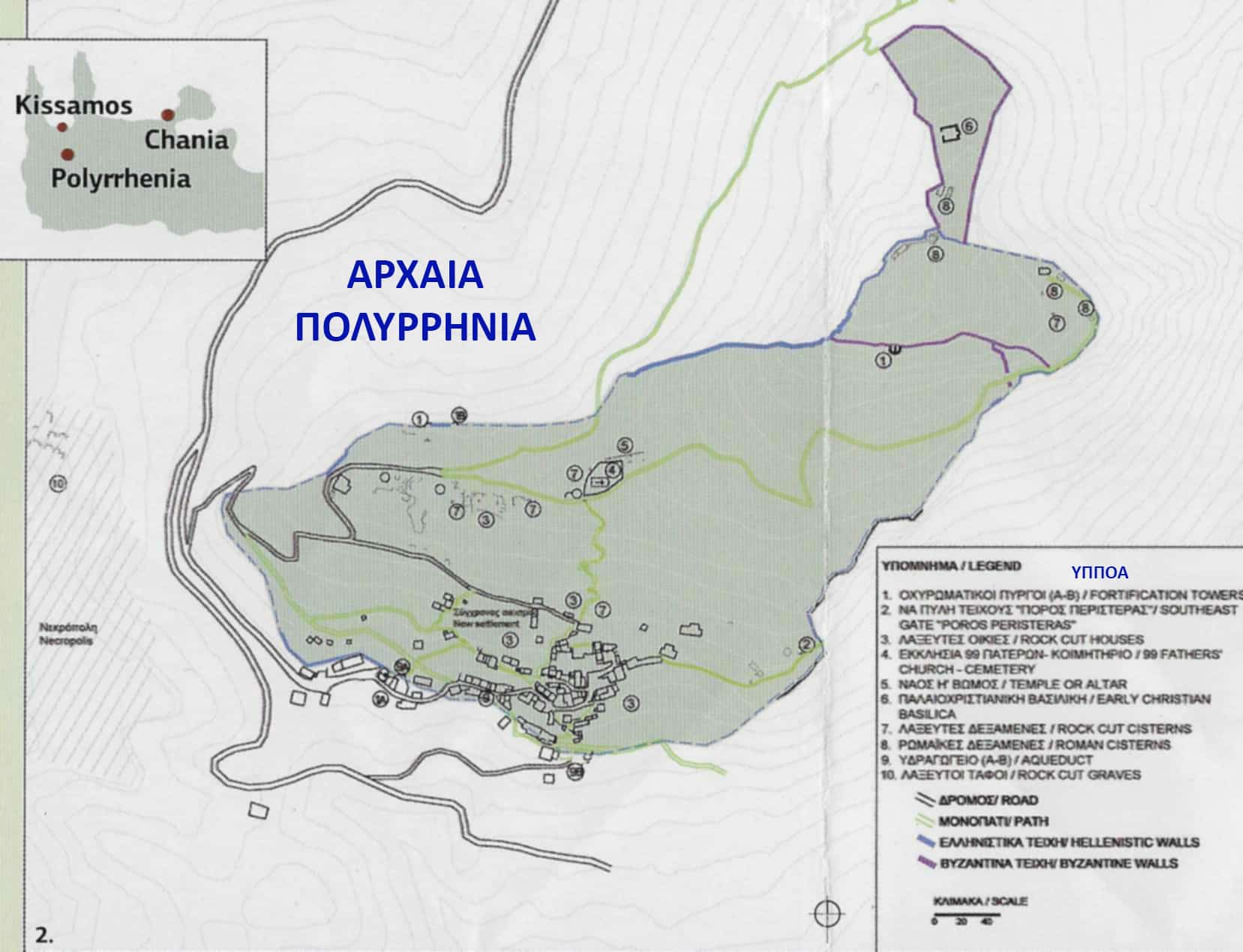 ακροπολη αρχαια Πολυρρηνια, ΙΝ ιερος ναος εκκλησια 99 Αγιων Πατερων, αρχαιοι λιθοι επιγραφες πολη Αχαιοι Κρητη ακροπολις Πολυρρηνεια αγιοι Πατερες αρχαιο δομικο υλικο λιθοι επιγραφη αχαια Κρητης Πολυρηνια, Πολυρηνεια πολις ελληνιστικη περιοδος οικισμος ευρημα προιστορια προιστορικα χρονια Στραβων ιδρυη οικισμοι Σπαρτη λακωνια, Μηλος κυκλαδες, Ροδος δωδεκανησα, Θηβα βοιωτια παραλια Ιωνια αιγυπτος ελληνιστικα ναυτικη φαλασαρνα Κνωσος Κυδωνια αντιστασιακος αγωνας αρχαιες κρητικες πολεις Ρωμαιοι λεηλασια ρωμαικα ακμη ελεγχος Δικτυνναιο ιερο ιερον Δικτυννα νομισμα 4ος αιωνας πΧ ρωμαιοκρατια επαρχια Κισαμου, Κισαμος, Κισσαμου, Κισσαμος λιμανι, επιρροη στρατηγικη θεση φυσικο οχυρο τειχη, βυζαντινο οχυρωματικος ημικυκλικος πολυγωνικος πυργος οχυρωση αψιδωτη πυλη αψιδα Πορος της Περιστερας Περιστερα λαξευτη οικια κτιστη προσοψη λαξευτα σπιτια πηγη υδρευσης δημοσιο εργο λαξευτο υδραγωγειο, πλατεια οχυρωματικος νερο αγωγος συμπλεγμα υδραυλικο αδριανος 2ος αιωνας 117 – 138 μΧ επισκευη υδρομαστευτικη σηραγγα υπογεια στοα συστημα υπερχειλιση μηχανισμος αφαιρουμενο φραγμα λαξευτη υποσκαφη δεξαμενη, υποσκαφο υποσκαφα πηλινος ανοικτος αγωγοι υδρευση λειτουργει ακομη τροφοδοσια λαξευτες υπογειες δεξαμενες στερνα αρχαιολογικος χωρος ρωμαικη εποχη 19ος δομηση 3ος 1ος πΧ ανασκαφη αρχαιολογος χαλμπερτ Halbert Θεοφανειδης, αρχαιολογια μνημειωδης βωμος ελληνιστικος ναος 4ος θεα αρτεμη αρτεμις ερειπια παλαιοχριστιανικη βασιλικη λειψανα νεκροπολη, συσταδα υπεργειος υπογειος λαξευτος ταφος ταφικος θαλαμος, ταφικη αλεξανδρεια ισοπεδο οροπεδιο αρχαιολογικος χαρτης 35ος παραλληλος