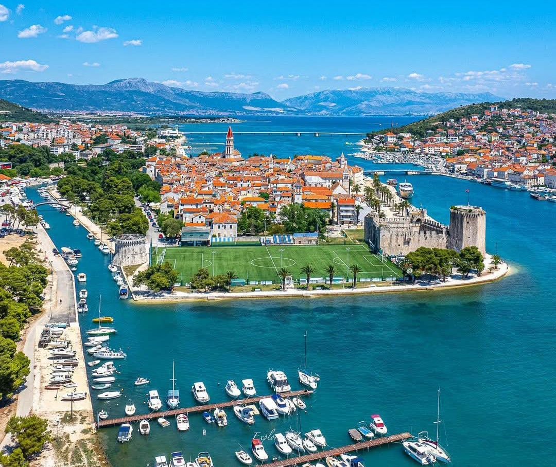 Το νησακι του Τράγου – νυν Trogir. Δεξιά, στον Κόλπο της Καστέλας, το άλλο νησάκι Čiovo, αρχαία ελληνικά Βους > λατ. Bua ή Boa, Bubus, Bavo – ΠΗΓΗ: Πλίνιος Πρεσβύτερος (“Φυσική Ιστορία”, 3.26). Λένε πως το κροατικό του όνομα προέρχεται από το λατινικό Caput Iovis.