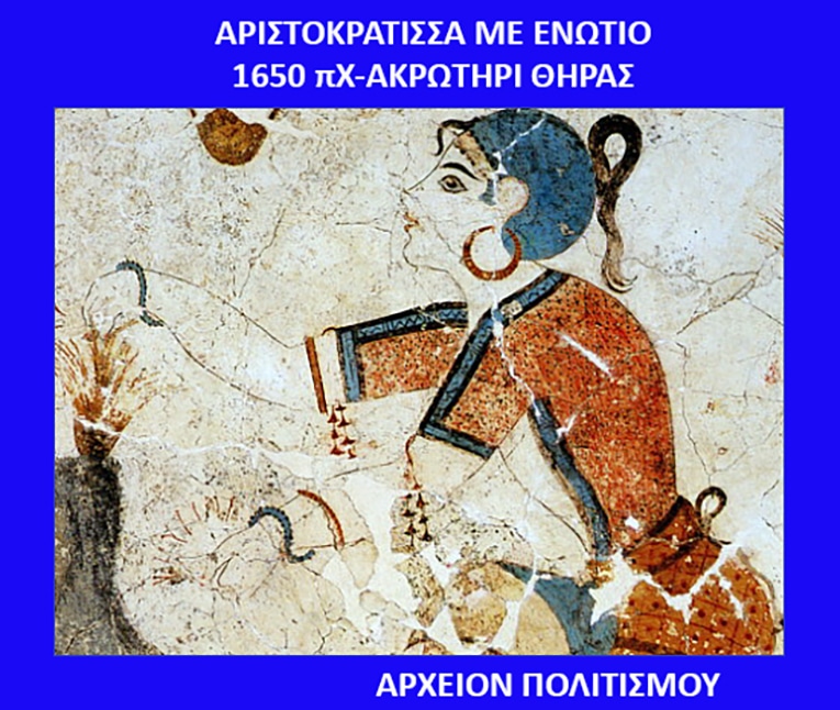 Ενώτια-έργα τέχνης, χρυσά, ασημένια και χάλκινα, ήταν διαδεδομένα στον Μινωικό Πολιτισμό της Ελλάδος (2000 – 1600 π.Χ.). Παραδείγματα φαίνονται σε τοιχογραφίες στην Θήρα Κυκλάδων (παραπάνω φωτ.).