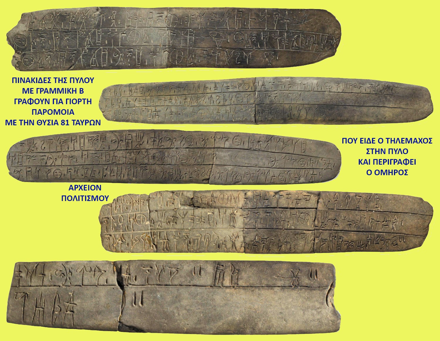 ΤΩΡΑ, οι αρχαιολόγοι έχουν βρει κάτι που πιθανότατα αποτελεί απογραφή μιας πολύ παρόμοιας τελετής, η οποία καταγράφεται σε πινακίδες που ανακαλύφθηκαν στην Πύλο! Οι μελετητές υποστηρίζουν ότι αναφορές σε μια τέτοια τελετή καταγράφονται σε 13 από τις περίπου 1.200 πήλινες πινακίδες, που ανακαλύφθηκαν στην Πύλο Μεσσηνίας, οι οποίες είναι χαραγμένες με Γραμμική Β, την ελληνική γραφή της Εποχής του Χαλκού [σ.σ.: 17ο ως τον 13ο αι. π.Χ. – επισήμως 5 αιώνες προ Ομήρου…].