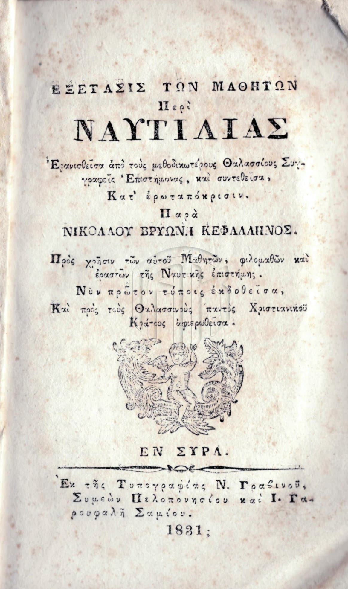 Βρυώνης Ν. «Ἐξέτασις τῶν Μαθητῶν Περὶ Ναυτιλίας Ἐρανισθεῖσα ἀπὸ τοὺς μεθοδικωτέρους Θαλασσίους Συγγραφεῖς Ἐπιστήμονας, καὶ συντεθεῖσα, Κατ` ἐρωταπόκρισιν. Παρὰ Νικολάου Βρυώνη Κεφαλλῆνος. Πρὸς χρῆσιν τῶν αὐτοῦ Μαθητῶν, φιλομαθῶν καὶ ἐραστῶν τῆς Ναυτικῆς Ἐπιστήμης. Νῦν πρῶτον τύποις ἐκδοθεῖσα, Καὶ πρὸς τοὺς Θαλασσινοὺς παντὸς Χριστιανικοῦ Κράτους ἀφιερωθεῖσα. Ἐν Σύρᾳ. Ἐκ τῆς Τυπογραφίας Ν. Γραβινοῦ, Συμεὼν Πελοπονησίου καὶ Ι. Γαρουφαλῆ Σαμίου. 1831».[10]