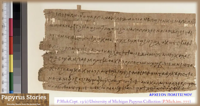 […] έχετε κάνει ένα καλό πράγμα για μένα – αναγνωρίσατε το κλάμα των παιδιών μου – θα το ξεπληρώσω με ευγνωμοσύνη και χωρίς διαφωνία» ΠΗΓΗ: Πανεπιστήμιο του Μίσιγκαν, Συλλογή Παπύρων, Papyrus stories, 12.11.2020, μτφρ. Α. Λ. για το ΑΡΧΕΙΟΝ ΠΟΛΙΤΙΣΜΟΥ, 13.11.2020. ΛΕΞΕΙΣ: δανειο, Δαμιανος, παιδια, 7ος αιωνας, Fayum, Φαγιουμ, Αιγυπτος, Ελληνες, αρχαιο δανειο, Shenoute, συμβαση […]