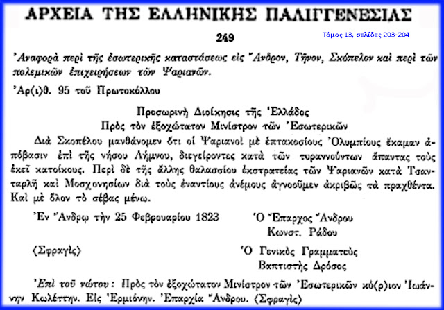ΠΕΡΙΣΣΟΤΕΡΑ για την ΕΠΑΝΑΣΤΑΣΗ του 1821, ΕΔΩ. Για τα ΨΑΡΑ, ΕΔΩ και για την ΛΗΜΝΟ, ΕΔΩ. Ψαριανοι, Ολυμπιοι, Μακεδονες, Θεσσαλοι, Λημνος, Μικρα Ασια, Ψαρα, Ολυμπος, Μακεδονια, Θεσσαλια, Σκοπελος, αποβαση, 1823, τυραννια, Τσανταρλη, Τσανταρλι, Μοσχονησια, Ανδρος, Κωνσταντινος Ραδος, Βαπτιστης Δροσος, μινιστρος Εσωτερικων, Ιωαννης Κωλεττης, Ερμιονη psarianoi-me-olympious-xesikonoun-tin-limno-1852374825.jpeg - Αρχείον ΠολιτισμοÏÂ
