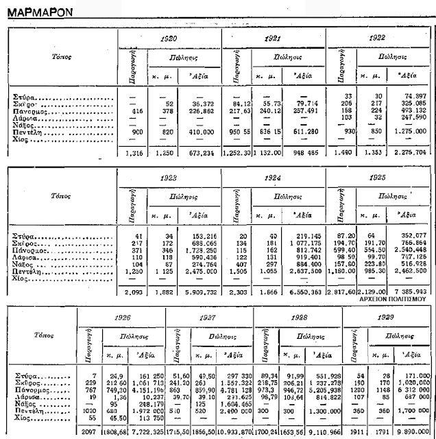 Πωλήσεις ελληνικών μαρμάρων 1920-1929 Του Γιώργου Λεκάκη Στατιστικός πίνακας εξορύξεως και πωλήσεως ελληνικών μαρμάρων (από Στύρα Ευβοίας, Σκύρο, Πάνορμο, Λάρισα, Νάξο, Πεντέλη, Χίο) κατά την δεκαετία 1920-1929, καθώς και των εισπραχθέντων ποσών εκ της αντιστοίχου αξίας αυτών: ΛΕΞΕΙΣ-ΚΛΕΙΔΙΑ: εξορυξη, μαρμαρο, μαρμαρα, Στυρα, Ευβοια, Σκυρος, Πανορμος, Λαρισα, Ναξος, Πεντελη, Χιος, ορυκτα, ορυκτος πλουτος %25CE%25BC%25CE%25AC%25CF%2581%25CE%25BC%25CE%25B1%25CF%2581%25CE%25BF-1920-1929.jpeg - Αρχείον ΠολιτισμοÏÂ