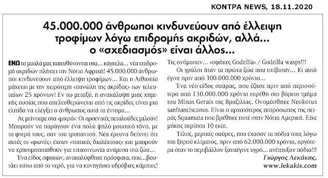 […] ανέπτυξαν πόδια!!! ΠΗΓΗ: εφημ. ΚΟΝΤΡΑ NEWS, ΑΡΧΕΙΟΝ ΠΟΛΙΤΙΣΜΟΥ, 18.11.2020. ΛΕΞΕΙΣ: ανθρωποι, ελλειψη τροφιμων, επιδρομη ακριδων, ακριδα, Νοτια Αφρικη, τροφιμα, Αιθιοπια, πανωλη της ακριδας, χημικη ουσια, εντομα, αρσενικη πεταλουδα, μουσικος τονος, φτερα, τρυπανι, φωνη, τοπικη διαλεκτος, ντοπιολαλια, επικοινωνια, ζωα, σφηκα, υδροβια καμπια, σφηκα Γκοτιζλα, Godzilla, Godzilla wasps, γρυλος, ζωο, τιτιβισμα, 300.000.000 χρονια πριν, σαυρα, 130.000.000 […]