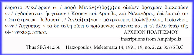 ΠΕΡΙΣΣΟΤΕΡΑ για την ΑΜΦΙΠΟΛΗ, ΕΔΩ. Του Γιώργου Λεκάκη O Λυκόφρων αγόρασε από τον Μένανδρο, για 280 δραχμές, ένα σπίτι του οποίου οι γείτονες είναι ο Κάσων, ο Δρούβις και ο Νίκανδρος, όταν ο Σπάργης ήταν επιστάτης. Εγγυητής / βεβαιωτής ο Αγλαϊνός. Μάρτυρες: Πολύβουλος, Ποίανθος, Άρχιππος. Ο αγοραστής θα πληρώσει όλους τους φόρους / […]