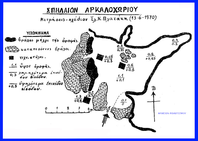[…] αντικείμενα. Αλλά οι προσφορές και τα αφιερώματα εξακολούθησαν οι πιστοί να τα αποθέτουν στους εξωτερικούς θαλάμους και απ’ έξω από την είσοδο τού σπηλαίου… Το σπήλαιο του Αρκαλοχωρίου ήταν ιερόν. Το σπήλαιο χρησιμοποιήθηκε σαν τόπος λατρείας από το 2500 π.Χ. Ελατρευόταν πιθανόν μια πολεμική θεότητα, αφού αφιέρωναν σ’ αυτήν μόνο όπλα. Ο Μαρινάτος υποθέτει […]