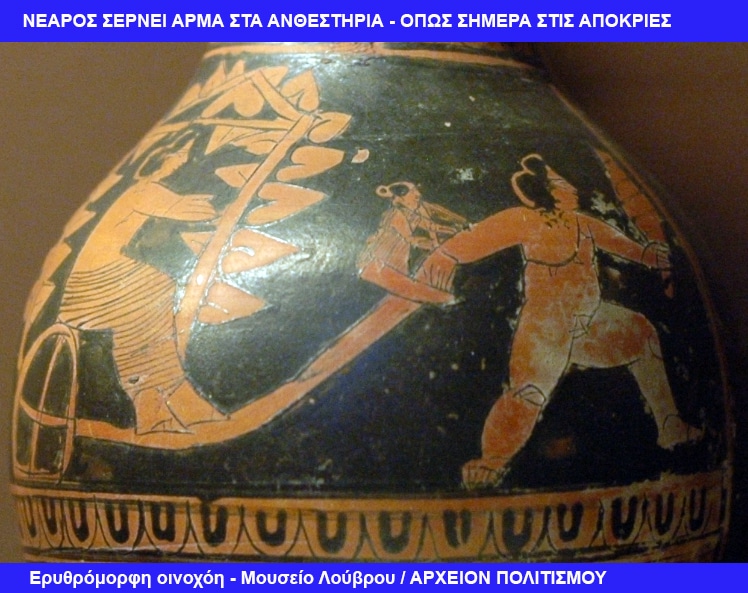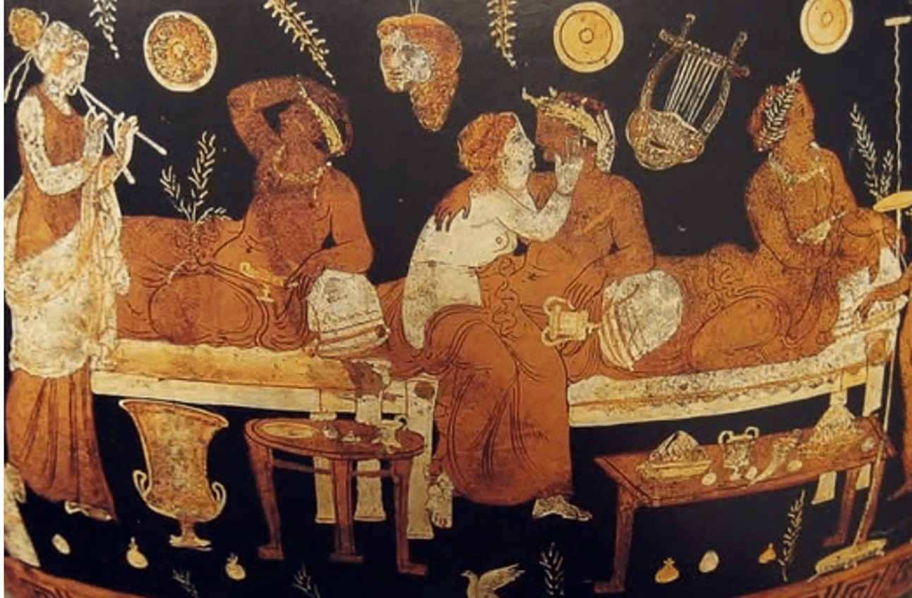 […] την οποία ο μεγαλύτερος συνδαιτυμόνας, και πιθανόν οικοδεσπότης της βραδιάς (αφού προβάλλεται στο κέντρο της παράστασης) αγγίζει ερωτικά (παρακάτω φωτ.). ΠΕΡΙΣΣΟΤΕΡΑ περι ΣΥΜΠΟΣΙΩΝ, ΕΔΩ. Τον κεφαλόπονο της οινοποσίας ξορκίζουν οι εταίροι με στεφάνια από φύλλα και άνθη συγκεκριμένων φυτών, συνήθεια εισηγμένη από τα θρησκευτικά πανηγύρια της Ιωνίας. Μπροστά τους είναι τοποθετημένα τραπεζάκια με εδέσματα, […]
